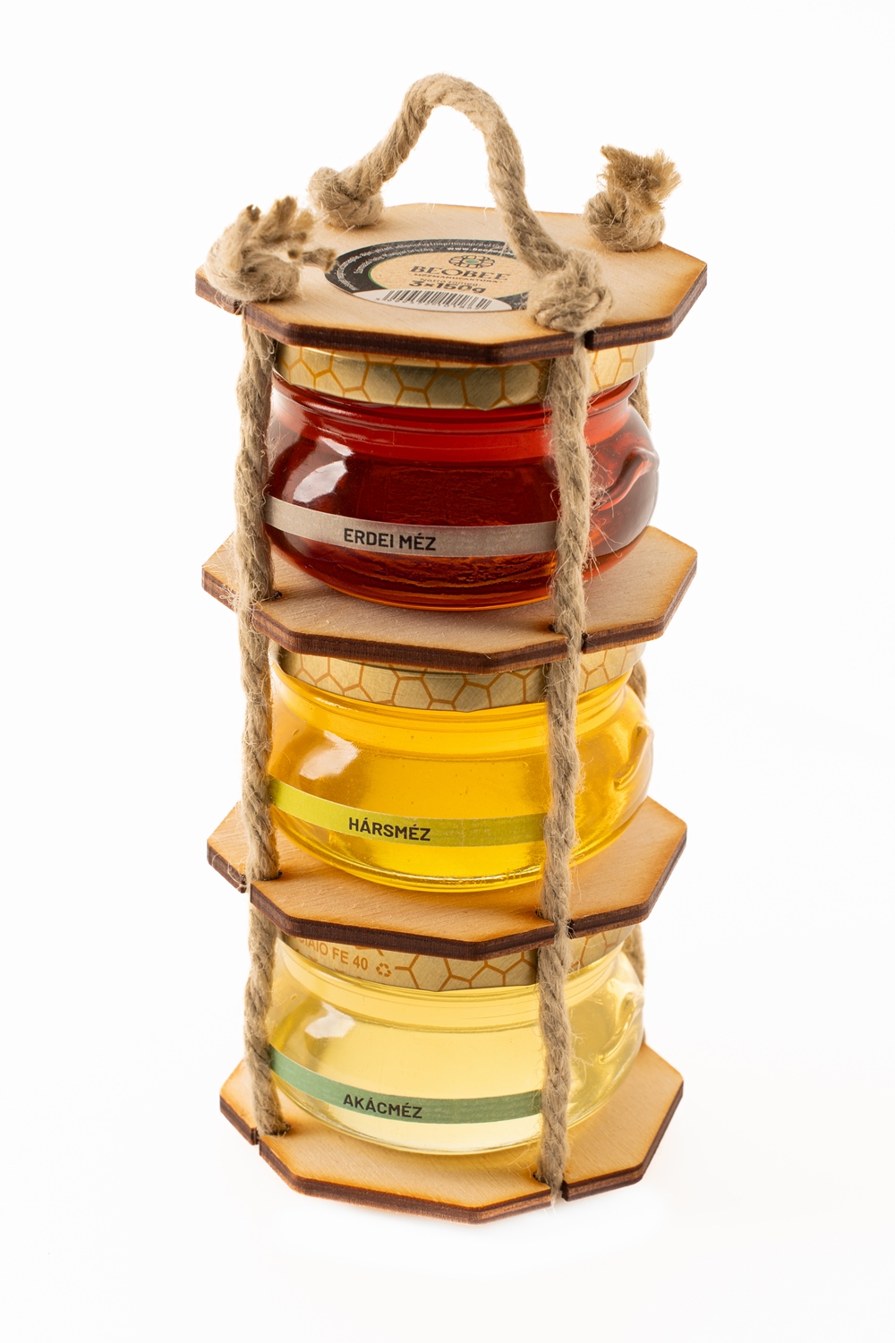 A nyitott kialakítású, kézzel készített elegáns fadobozban három üveg prémium BeoBee méz rejtőzik. A 100%-ban természetes magyar termelői akácméz, az örök klasszikus hársméz és a vegyes virágméz triumvirátusa nem csak szép, de hasznos ajándék. Mindegyik ínyencség más-más felhasználásra csábít.